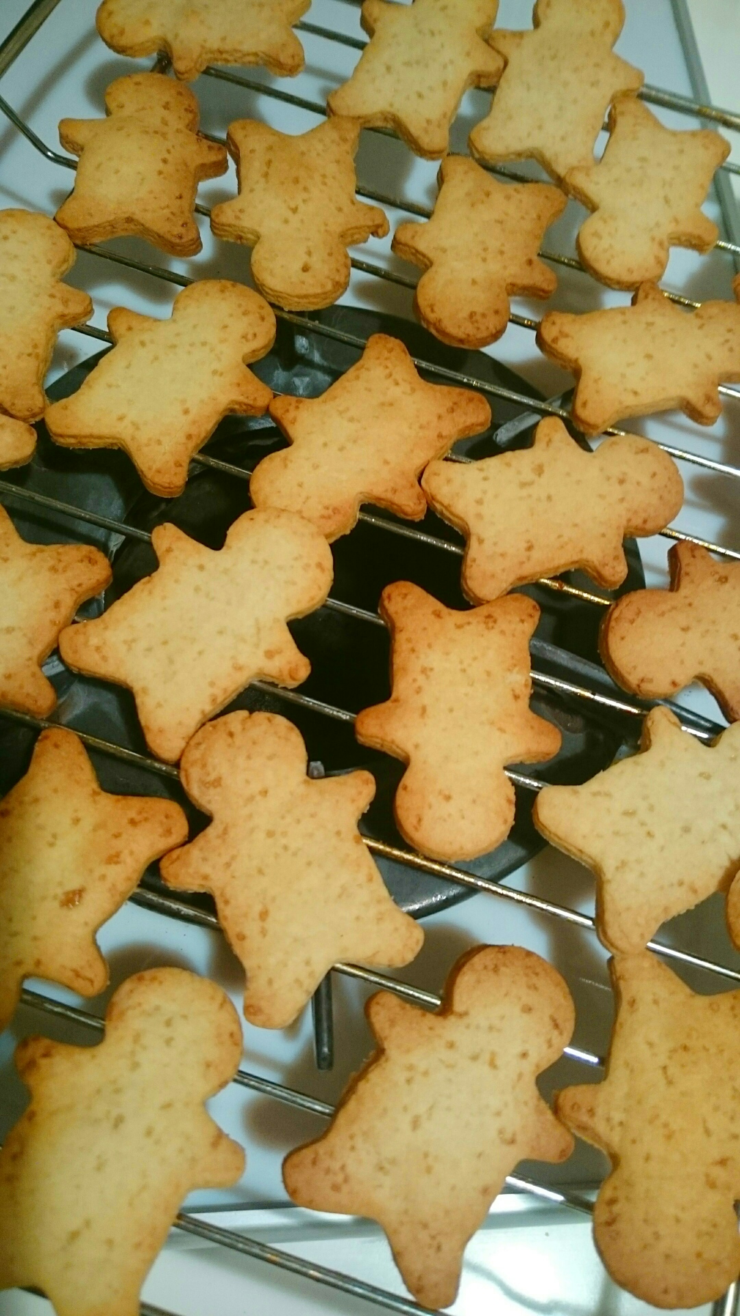 この季節に作るジンジャーマン。生姜は入ってませんが(^_^;)。砂糖の代わりに甜菜糖を入れたら、溶け残ってブツブツが残ってしまいました( ; ゜Д゜)。でも、バターをしっかり入れてるので味は良いです。伸ばしてるうちにこねてしまったみたいでちょっと固くなってしまいましたが……