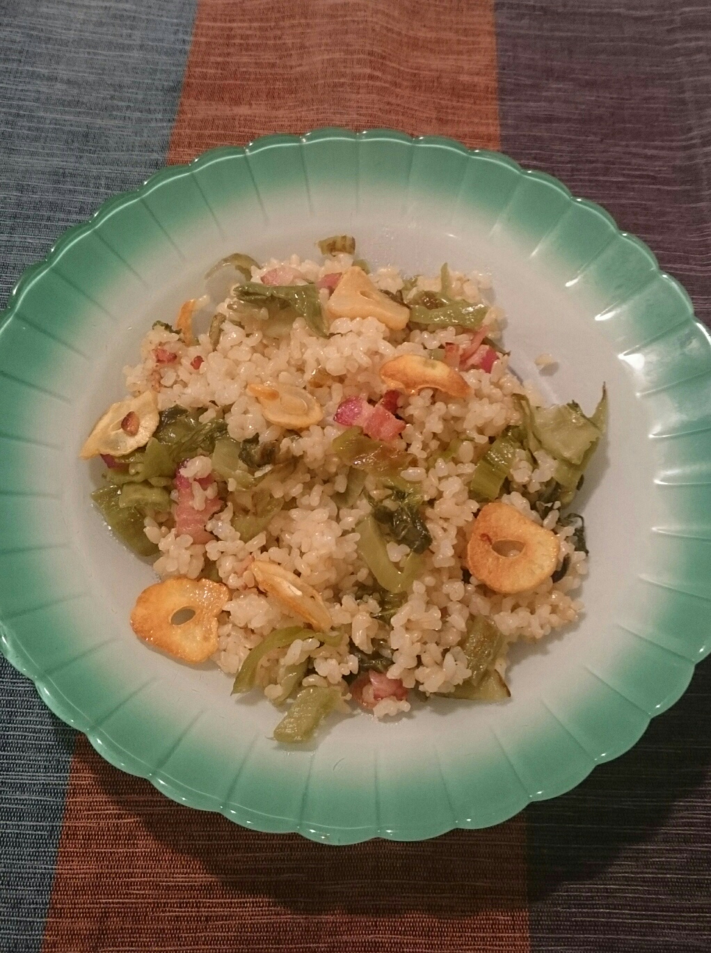 スライスしたにんにくを色よく炒め、カリカリになったら取り出します。次に刻んだベーコンを炒め、野沢菜を追加。ごはんを入れて炒め、最後ににんにくを戻して出来上がり。冷蔵庫の残りものを使いましたが、これはわざわざ作りたい‼と思えるくらい美味しかったです(^o^)。ベーコンはものすごく油が出るので、健康が気になる方は、キッチンペーパーで拭き取って下さい( ; ゜Д゜)。それと、材料の塩分が濃いので、野沢菜の塩抜きをした方がよかったかな……?仕上げの調味料は何も無しだったけど、少ししょっぱかったので(^_^;)。