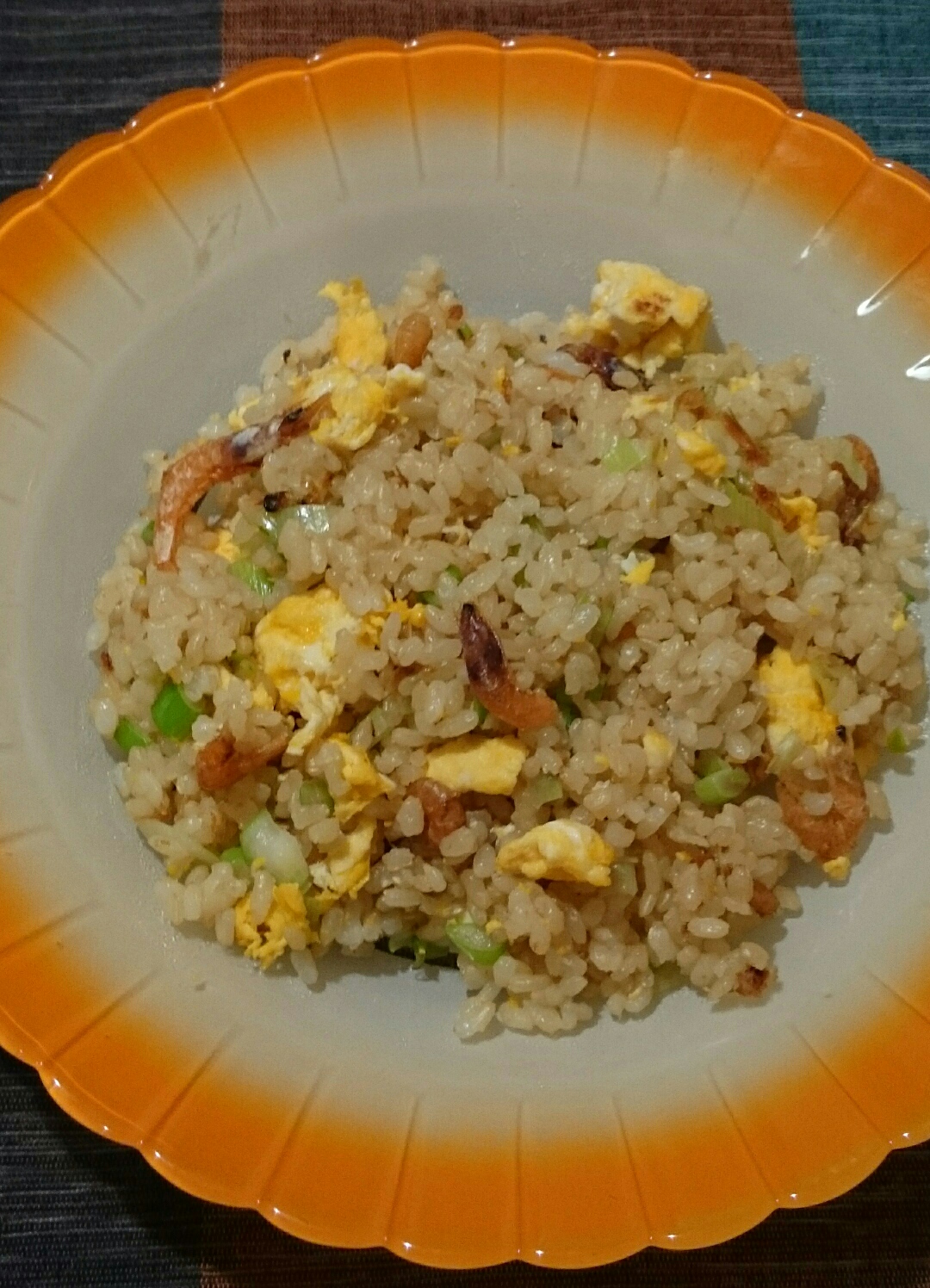 ネギチャーハンの上に、ニラ玉を乗せただけのご飯です。モタモタしていて卵がふわっとならなかったのですが(前にも同じ失敗をした……( ̄O ̄)。