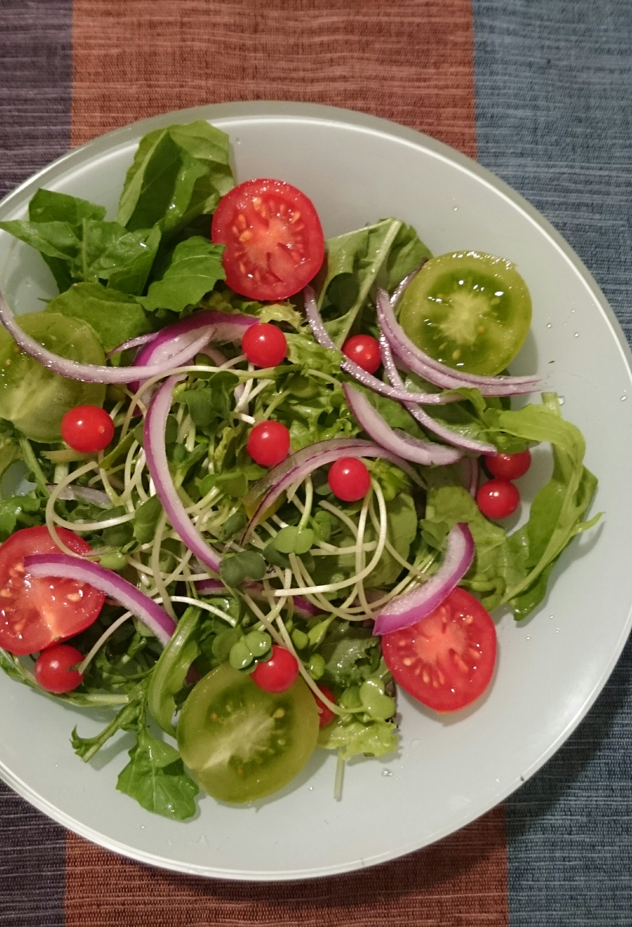 これは普通のグリーンサラダですが、珍しいトマトを買ったので飾りに使ってみました。グリーントマトと、小さいのはマイクロトマトといいます。マイクロトマトは以前育てたことがあるのですが、なかなか実がならなくて難しかったです。スーパーで見かけたのは初めて( ゜o゜)‼しかもとても安かった(^o^)v