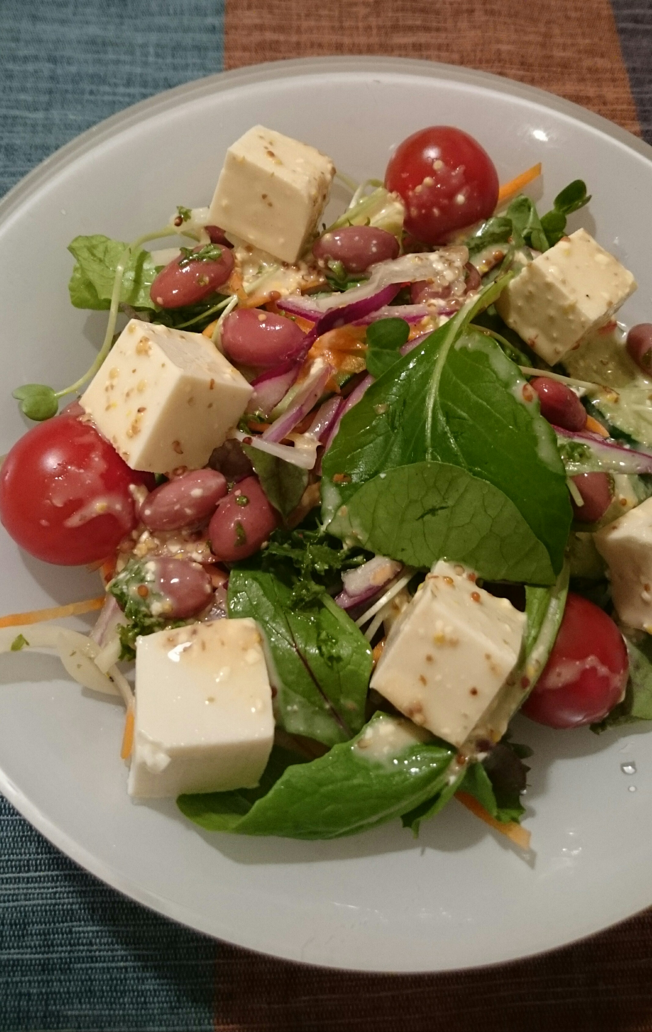 先日の豆腐サラダはじゃことかつおの和風でしたが、今日のはマヨネーズを使ったこってりバージョン(^o^)。ドレッシングは、マヨネーズ、酢、練りごま(またはごまドレ)を泡立器でよく混ぜます。コクがあって美味しい!それと、粒マスタードを入れると更にGood!このプチプチがたまりません(゜_゜)v。このタレは、冷奴とかに使ってもいいかも。