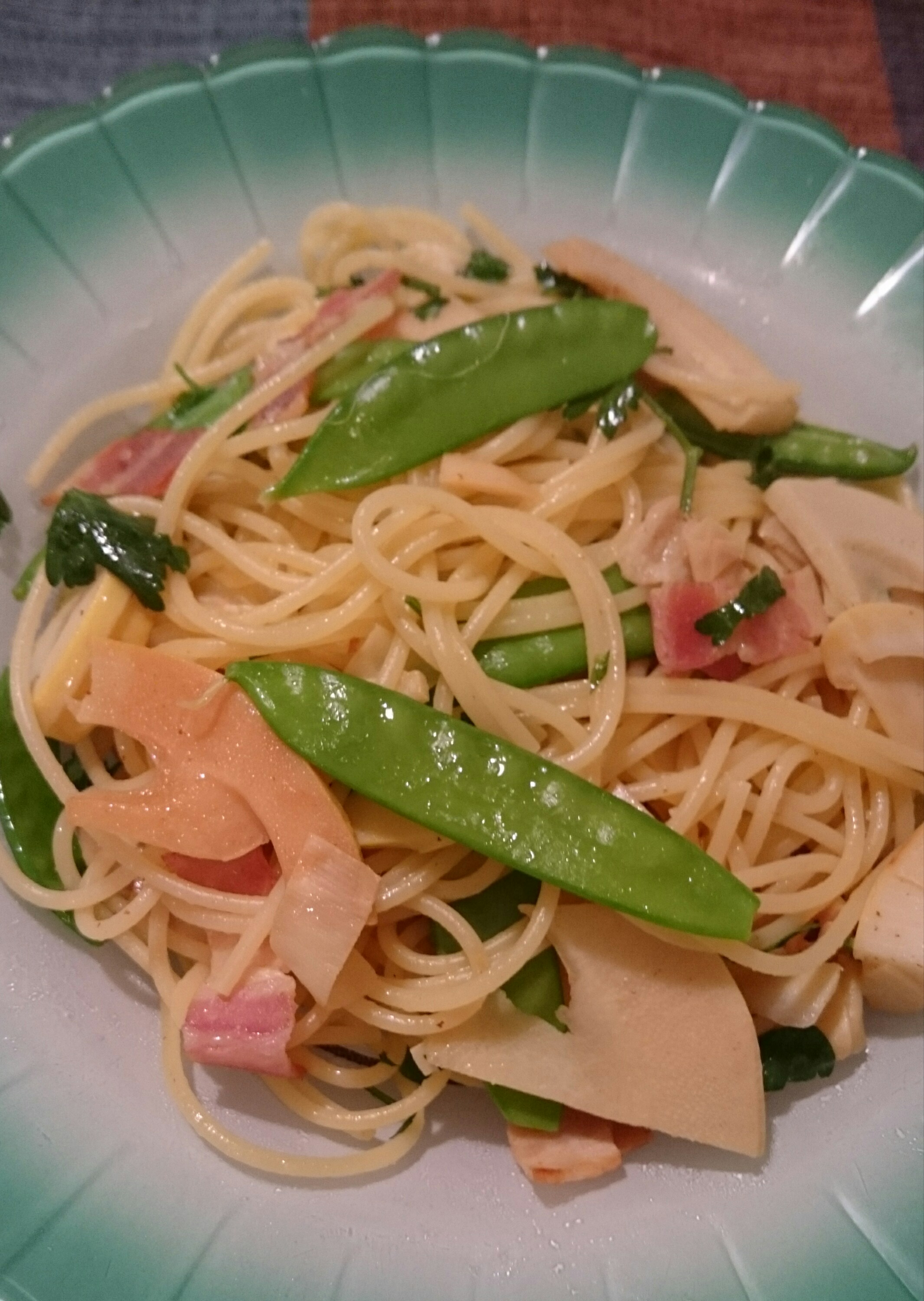 さっそく料理に使って美味しく頂きました。今年は筍ご飯と煮物を2回くらい作ったでしょうか。写真撮るのを忘れてしまいましたが…。そこで今日のは洋風に作ってみました。筍のパスタ。クリーム系のものとか、いろいろあるみたいですね。味が淡白なので、ニンニクとかベーコンで旨味を加えると良いみたい(^o^)。これは、ベーコンと炒めただけの簡単パスタです。絹さやで彩り良く、食べるときに粉チーズをかけると最高です。