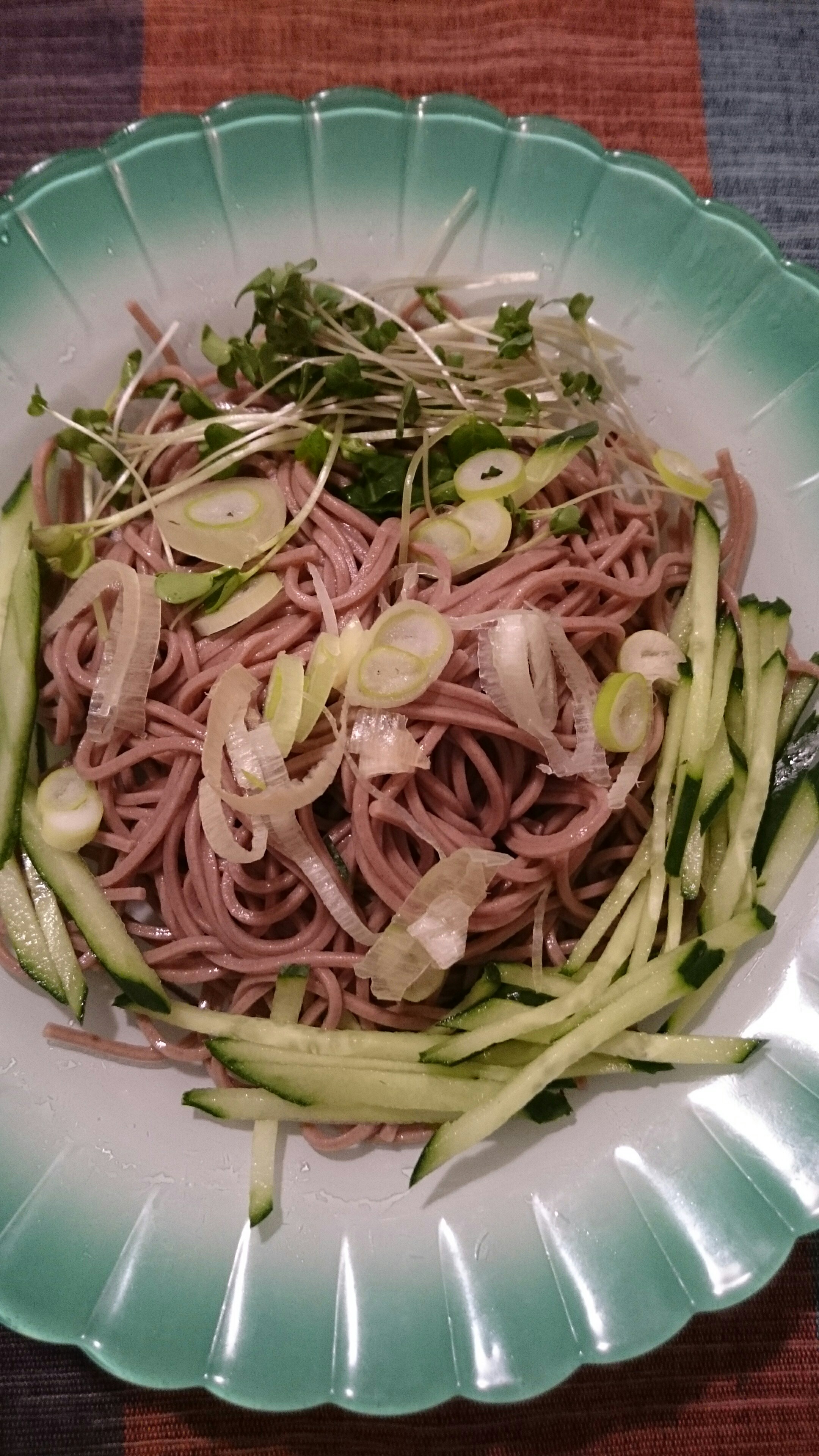 きゅうりの千切り、ネギなどを乗せた簡単そば。かつお節乗せるの忘れた!((((;゜Д゜)))なにか足りないと思ったら……