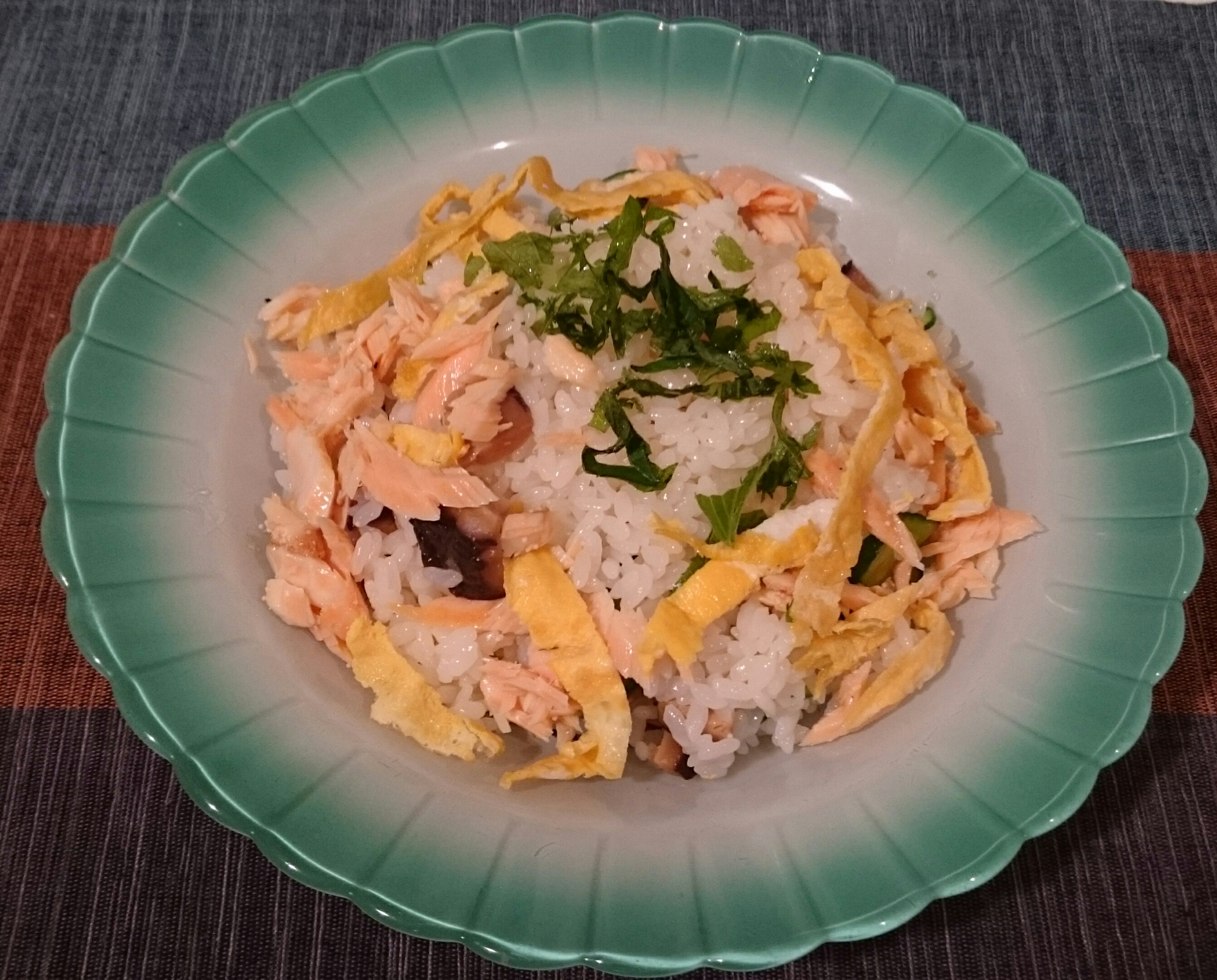 塩鮭のちらし寿司(°▽°)♪あまりにも暑くて食べたいものが決まらない……冷蔵庫に、おにぎり用に焼いた鮭が残ってる……早く食べなきゃ……と思い出して、簡単だけどチラシ寿司を作りました。干し椎茸の煮しめ、きゅうりの塩もみを入れたらそれらしく見えます(°▽°)。レンコンの甘酢漬けやかんぴょうはないけど、ひな祭りみたいに立派にしなくてもイイんです(^o^)/刻んだらっきょを入れたら、レンコンの代わりになって美味しかったぁ……らっきょうの漬け酢もごはんに混ぜて無駄なく利用(°▽°)♪薄焼き玉子を切って青じそを散らしたら、きれいなお寿司になりました。