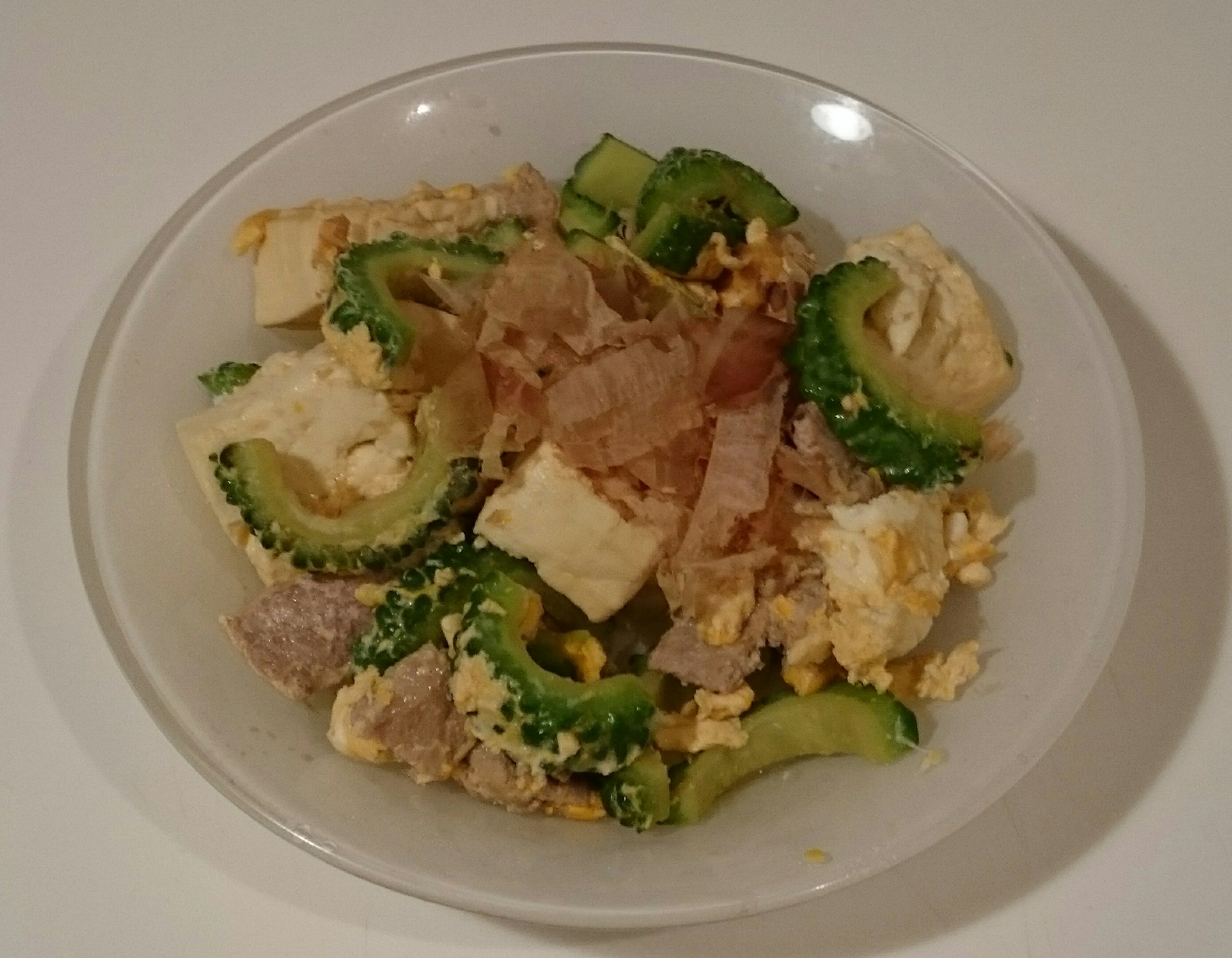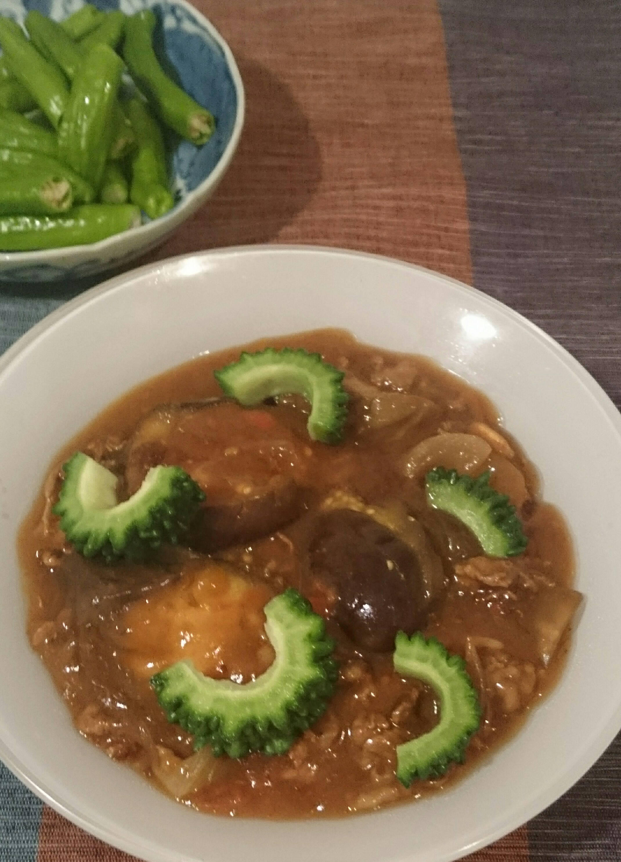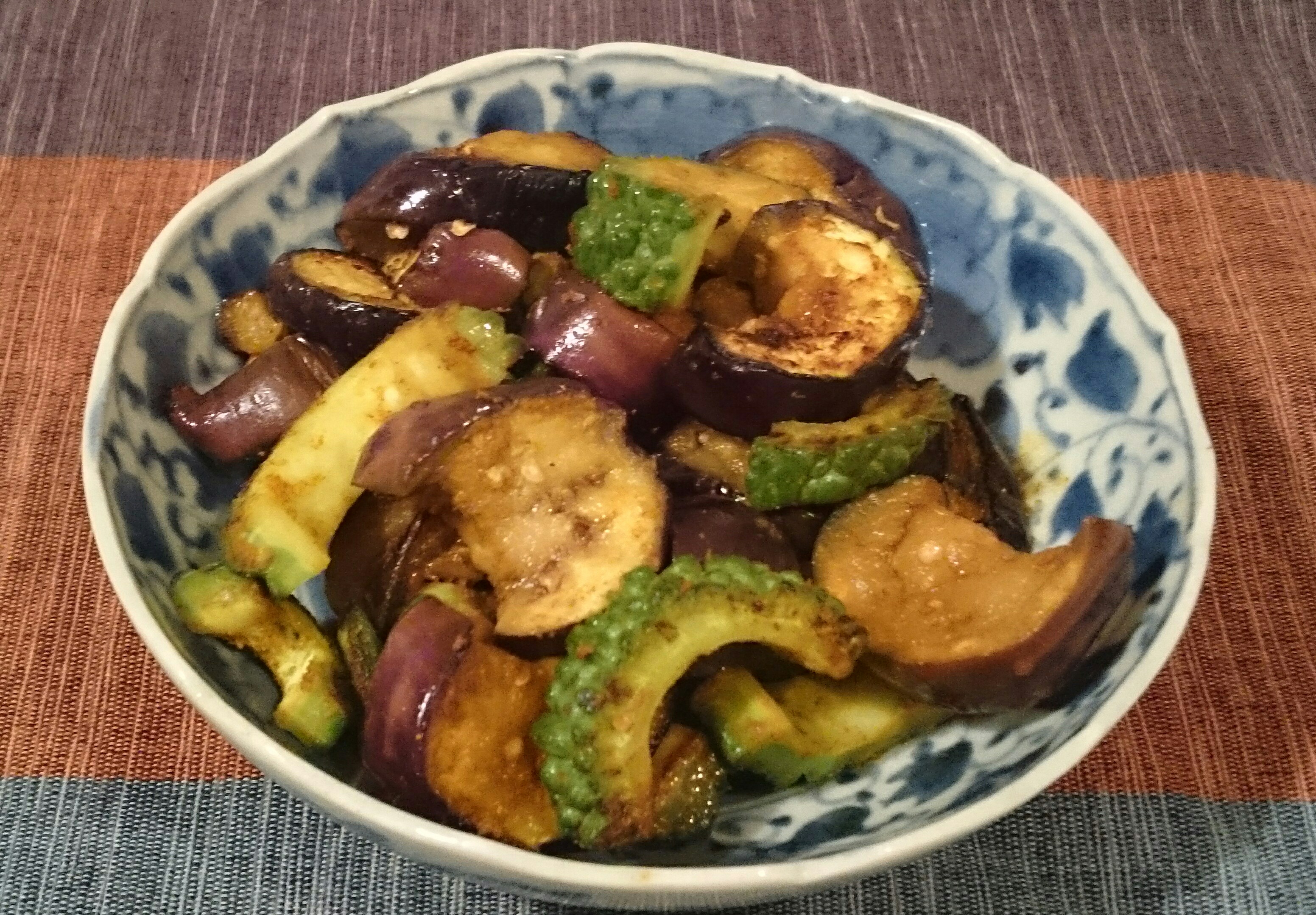 ゴーヤとなすが1/2ずつ残っていたので、カレー味の炒め物(°▽°)。適当に作ったのにすごく美味しかった。食べていて思いついたのですが、これにお豆腐を入れてカレーチャンプルーにしたらもっと美味しいかも……