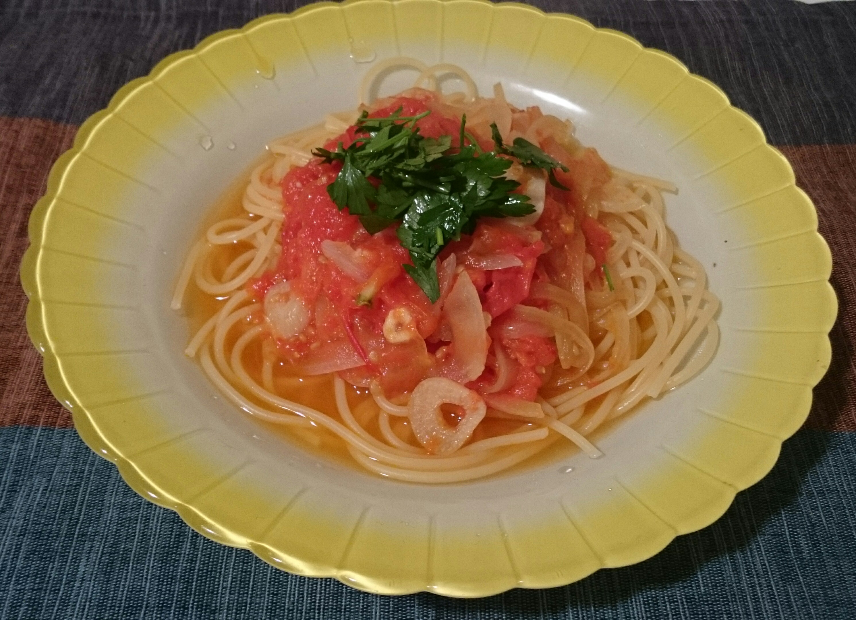 フレッシュなトマトって、どうして缶詰とこんなに違うのか……先日、茄子を食べてしまったので玉ねぎとトマトだけのシンプルな味。にんにくと唐辛子のペペロンチーノと並んで大好きなメニューです。ササッとできる簡単なものほど美味しいのはどうしてだろう……(^o^)?