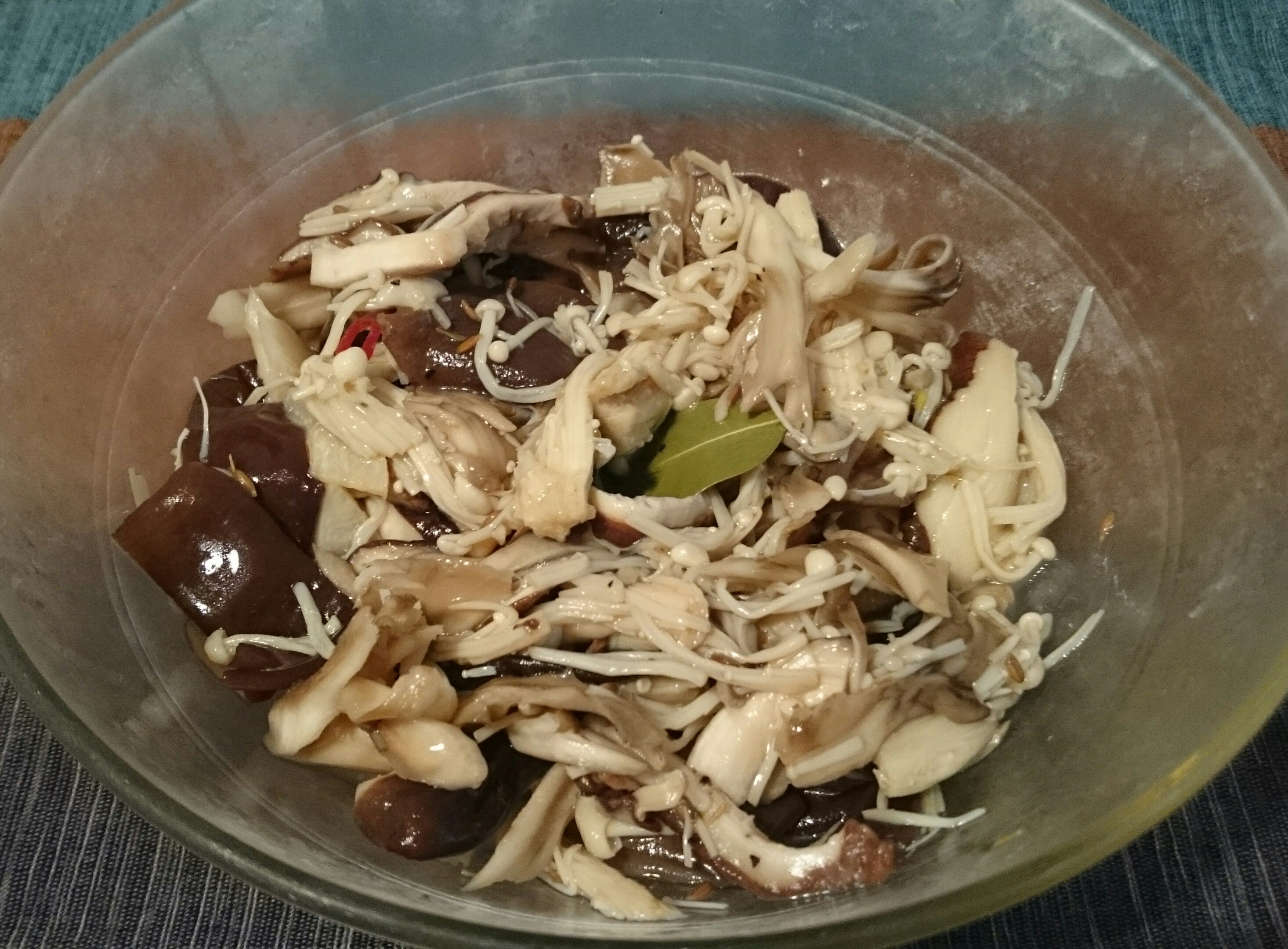 きのこの味噌汁を作ろうと思ったのですが、なぜか作れなかったのでわるくならないうちにマリネにしました。見た目、あんまりきれいじゃないんですけど……( ̄O ̄)(汗)。でも、そのまま食べたり、輪切りトマトに乗っけたり、食べ方イロイロで重宝します。個人的にはなめこ、えのきが好きです。それと鍋には舞茸が必須です(‼)