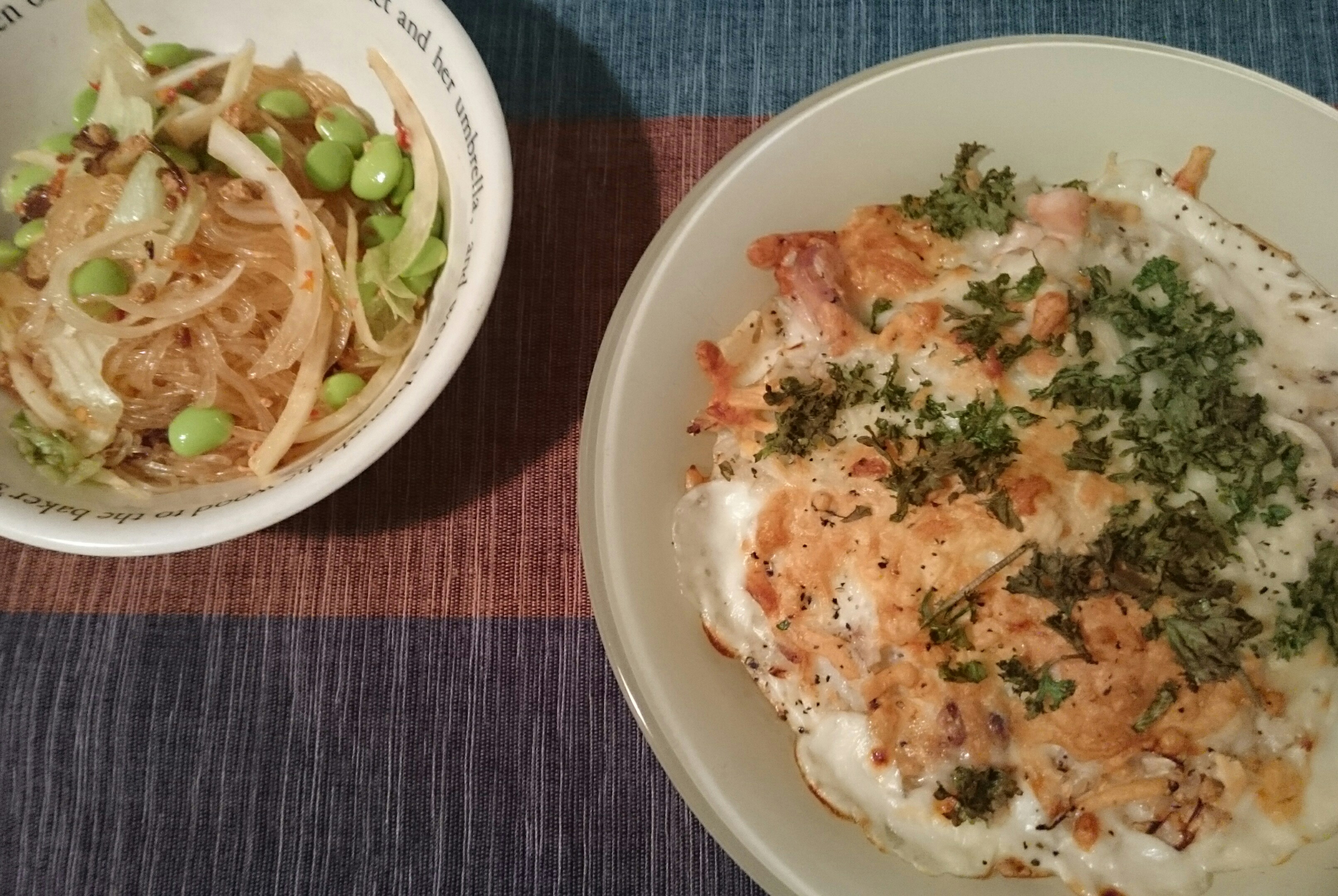 サラダは、タイ風春雨サラダです。さっぱりしていて口直しにちょうど良い。いま、パクチーがすごく流行ってますね。エスニック料理ではよく使うハーブだけど、苦手という人も多いです。ちょっとくせのある風味なのですが、私は大好き(〃▽〃)♪苦手な食べ物ってほとんど思いつかないな?!持っているカレーのレシピ本に「羊の脳みそカレー」っていう衝撃の料理が載ってるんですが、食べる勇気のないものはそれくらい(笑)。あとは何でも美味しく頂けます。あと「くさや」というのが未体験なので、興味あり。いつか出会ってみたい…くさや(°▽°)♪