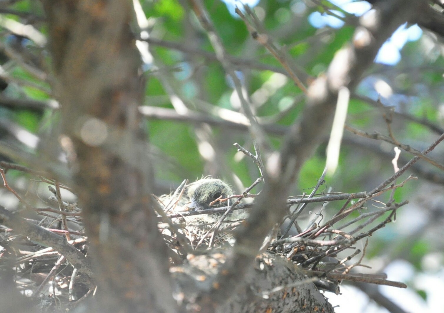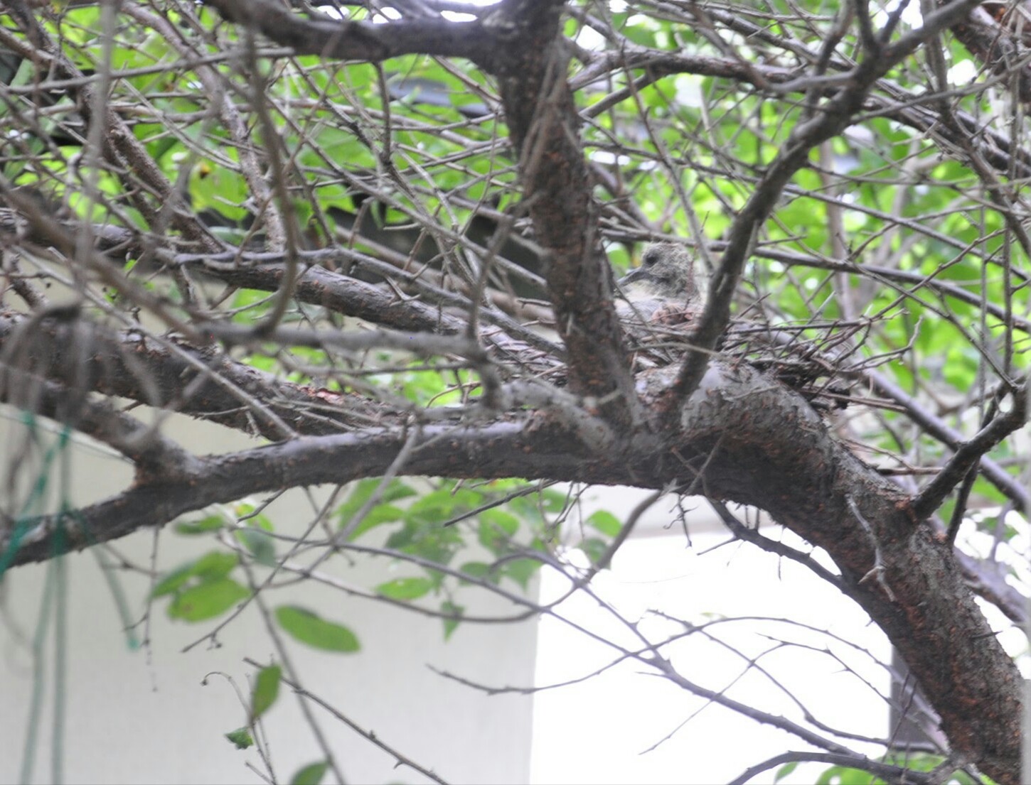 9月9日。梅の木に鳩のヒナを発見。生まれたばかりで頭に綿毛が少々あるのみ。親鳥がずっと巣にいたから玉子を温めていたのでしょう。親はたまに戻りますが、ほとんど留守にしています。こちらに気づくと目をパチパチさせて可愛らしい。