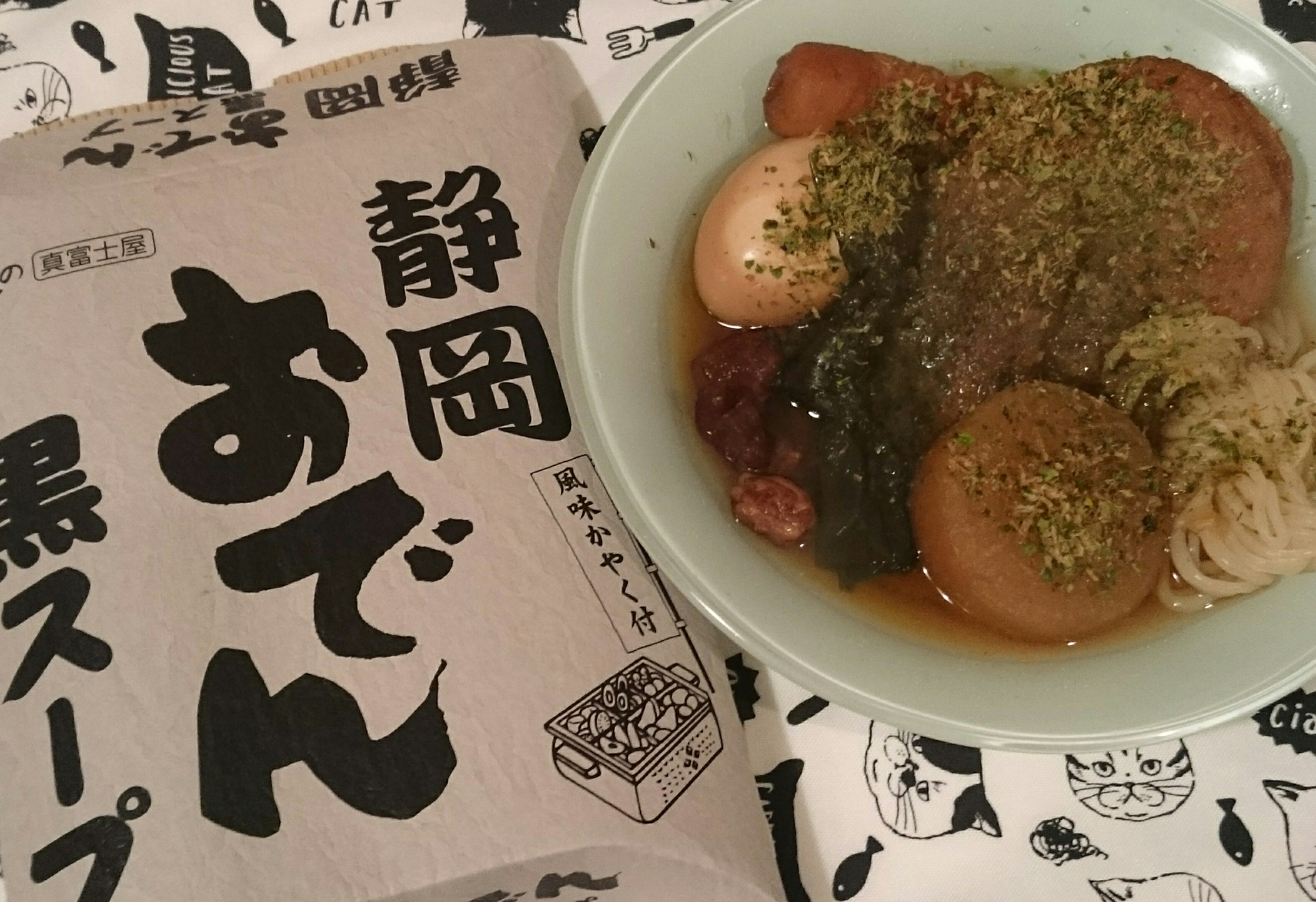 以前、「孤独のグルメ」で井の頭吾郎さんが食べていて気になっていた静岡おでん(°▽°)♪どんなものか試してみようと思って買ってみました。1人分なので少ないのですが、噂どおりつゆが黒い‼醤油がたくさん入っててしょっぱいのか……?と心配でしたが、美味しかったです。牛すじでだしを取るのが静岡おでんの特長だとか。持っている料理本に「牛すじ大根」というメニューがあるけど、これにちょっと似ています。このおでんは、食べるときに青海苔&かつお節を振りかけます。練りがらしもいいけど、こちらも新鮮。普通のおでんの時も掛けて食べたい(^o^)♪