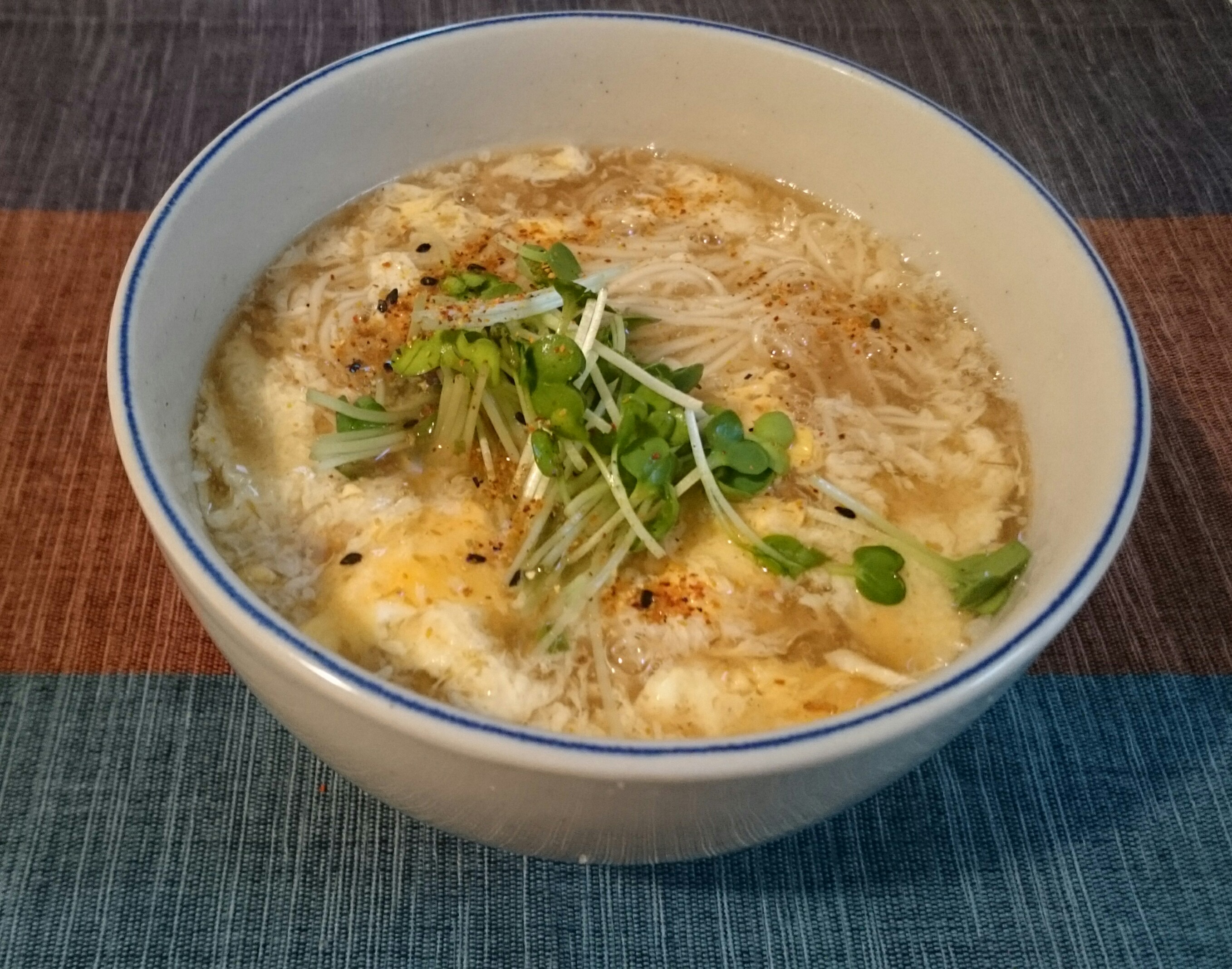 風邪のときは、温かくて汁っぽいものが食べたくなります。そこで、夏の残りそうめんでかきたまにゅうめん(^o^)。スープはだしと醤油、おろし生姜です。そうめんはすぐゆだるから、お腹が空いて早く食べたいというときにも便利ですね(°▽°)♪