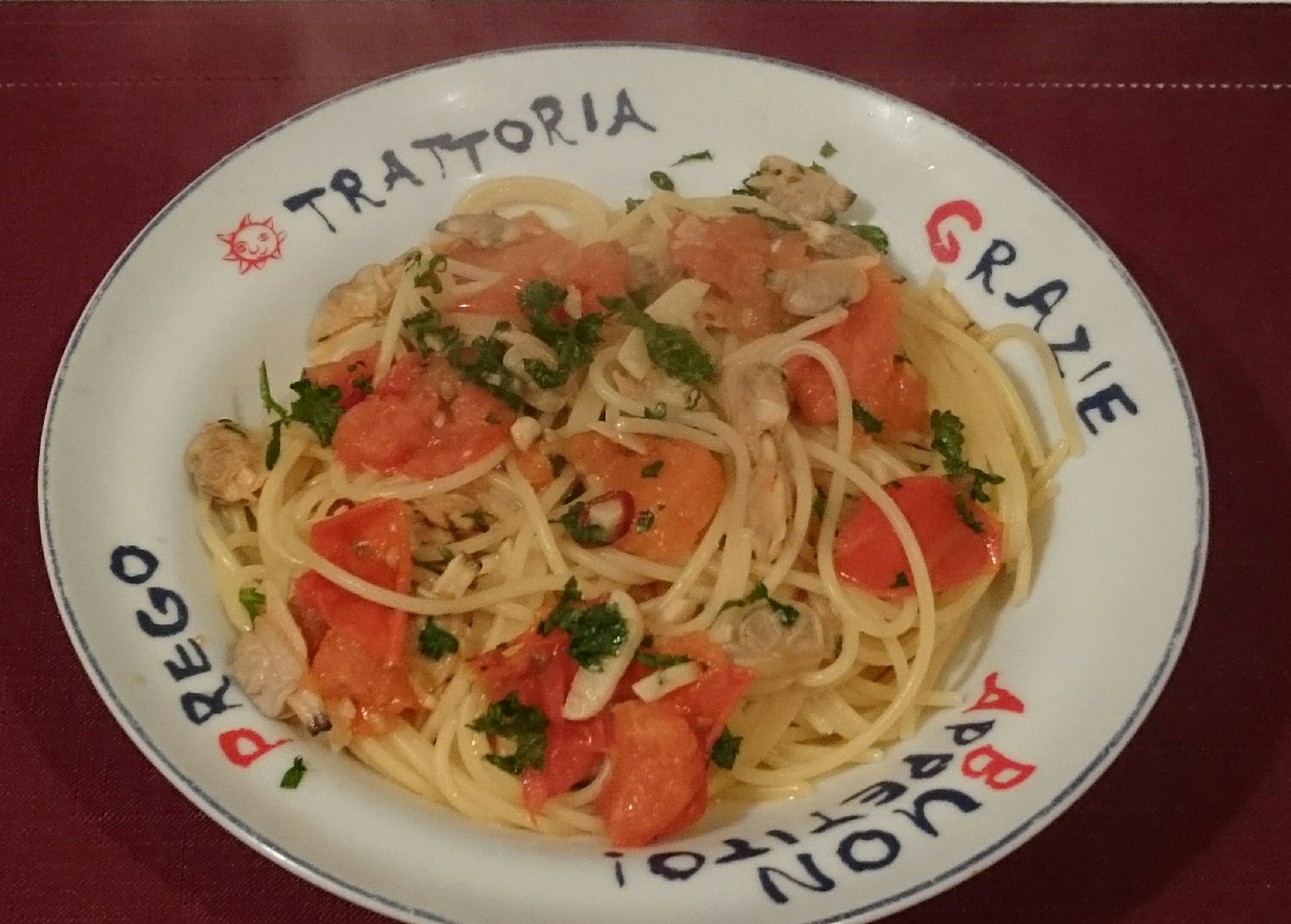 サッパリしたパスタが食べたいな?と思って、あさりのパスタにトマトを入れました。トマトが入ると旨味が増して美味しくなるのでオススメです(°▽°)♪あさりと良いコンビ。