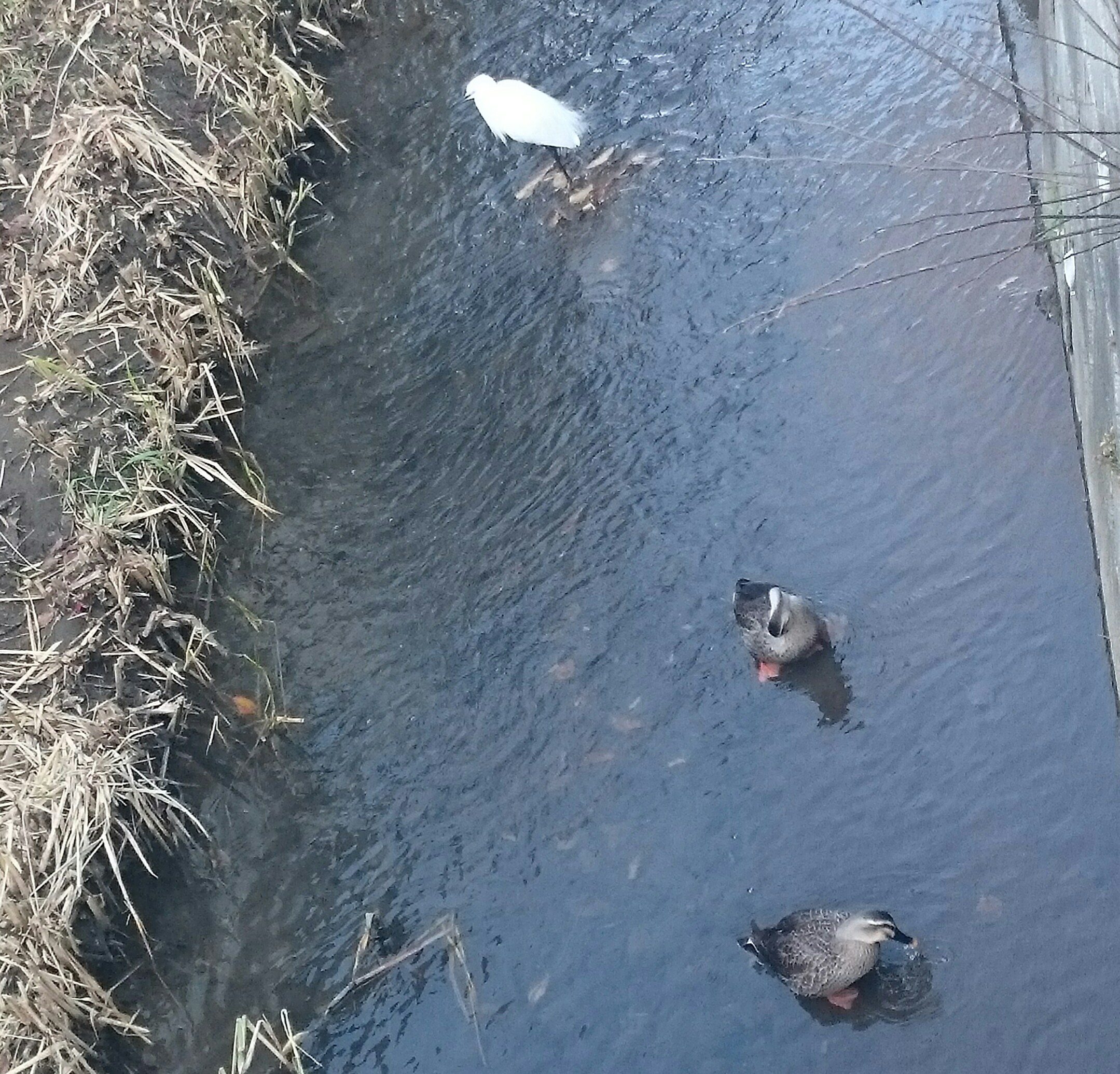 写真は通勤途中に会うカモです。冷たい水の中でも仲良く泳いでます