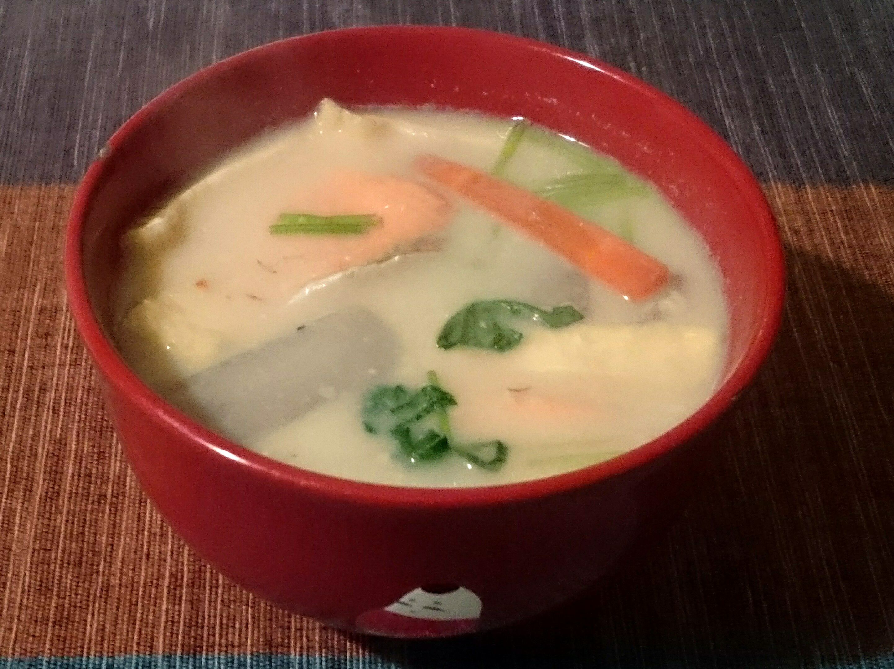 先日作った粕汁ですが、なんだかハマっています(°▽°)♪塩鮭がなくても、野菜とあぶらげ、キノコなどで十分美味しい。酒粕と味噌で作りますが、うどんのつゆとか醤油ベースのスープでも美味しくできました。酒粕ってちょっと苦手だったんですけど、お酒の匂いが強くなりすぎないようにすれば良いかな?と思います。しかしカロリーもあるので食べ過ぎにはご注意ください( ̄O ̄;)