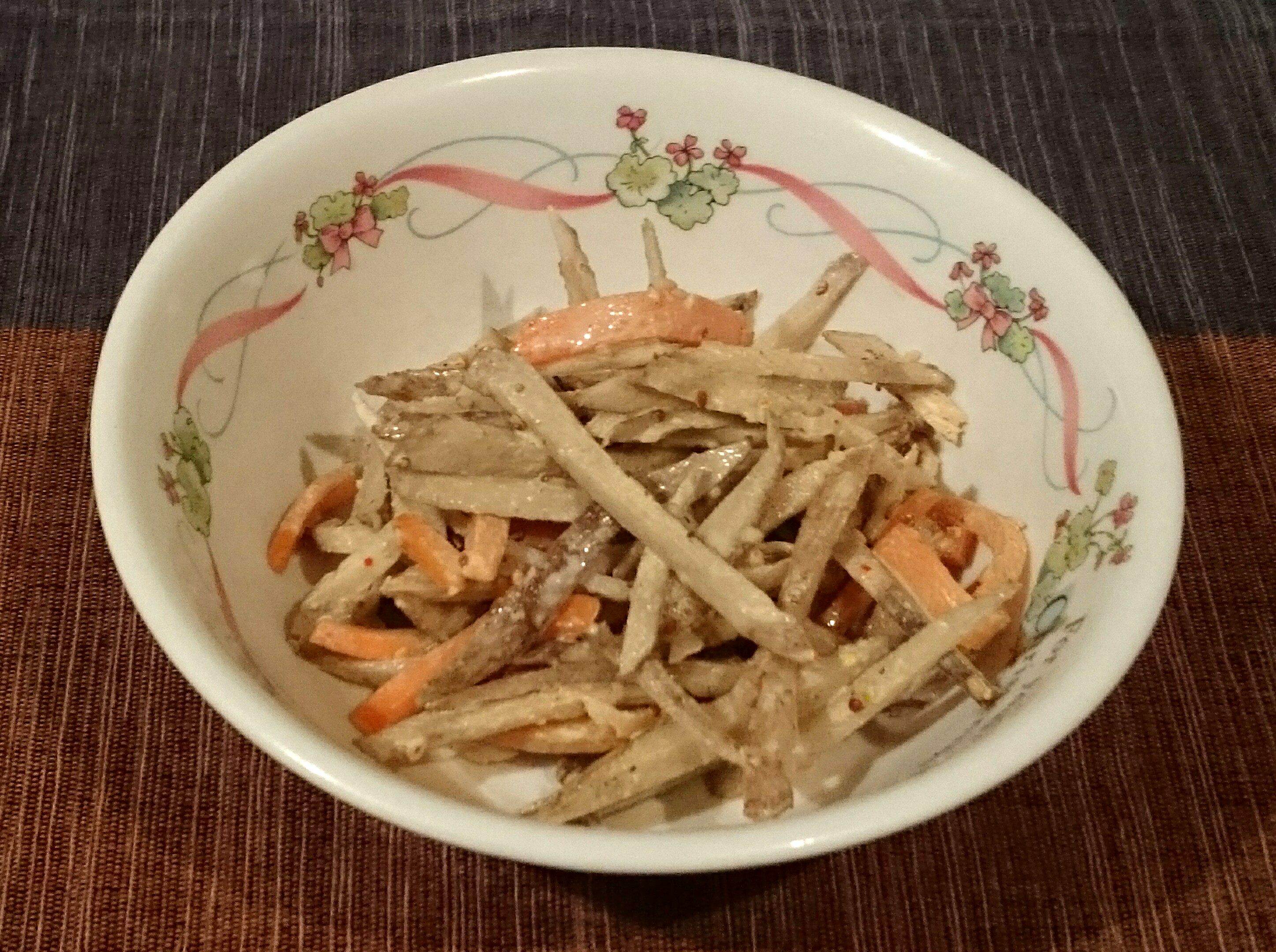 残っていたごぼうでサラダ(^o^)。軽く湯がいて、酢、マヨネーズ。これに醤油少々と唐辛子、ゴマを入れると和風のごぼうサラダになります。ご飯のときのお惣菜にも!唐辛子は七味を入れてみたんですが、意外と合う✨
