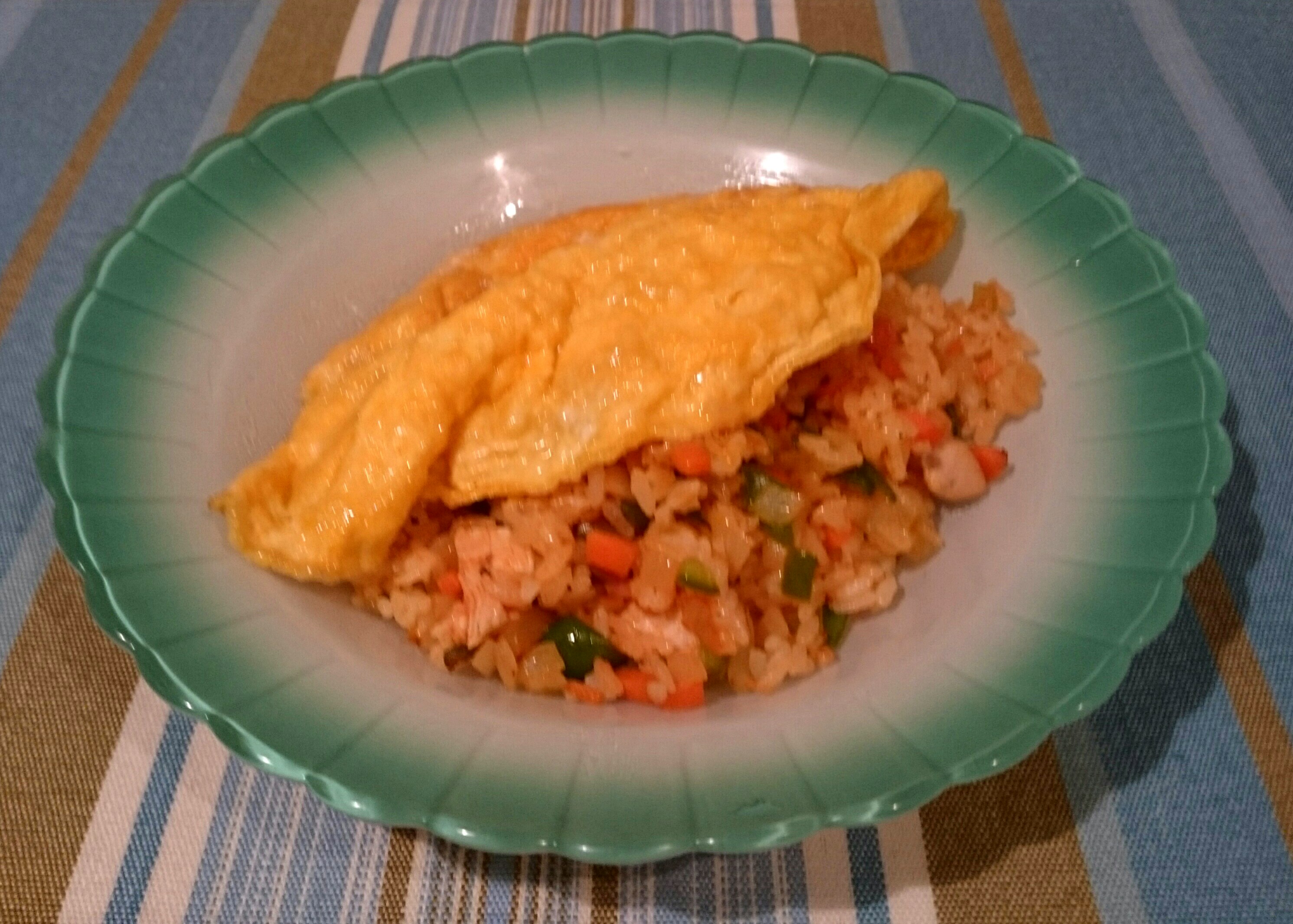 とろとろの卵とチキンライスが一体になるようにしたかったのだけど、なかなか難しいです。卵焼きの作り方を本で見ると「形はあとで整えればいいから、半熟でもどんどん巻く」と書いてあります。やっぱりオムライスも、半熟のうちに火を止めないといけないのかも…(°▽°;)