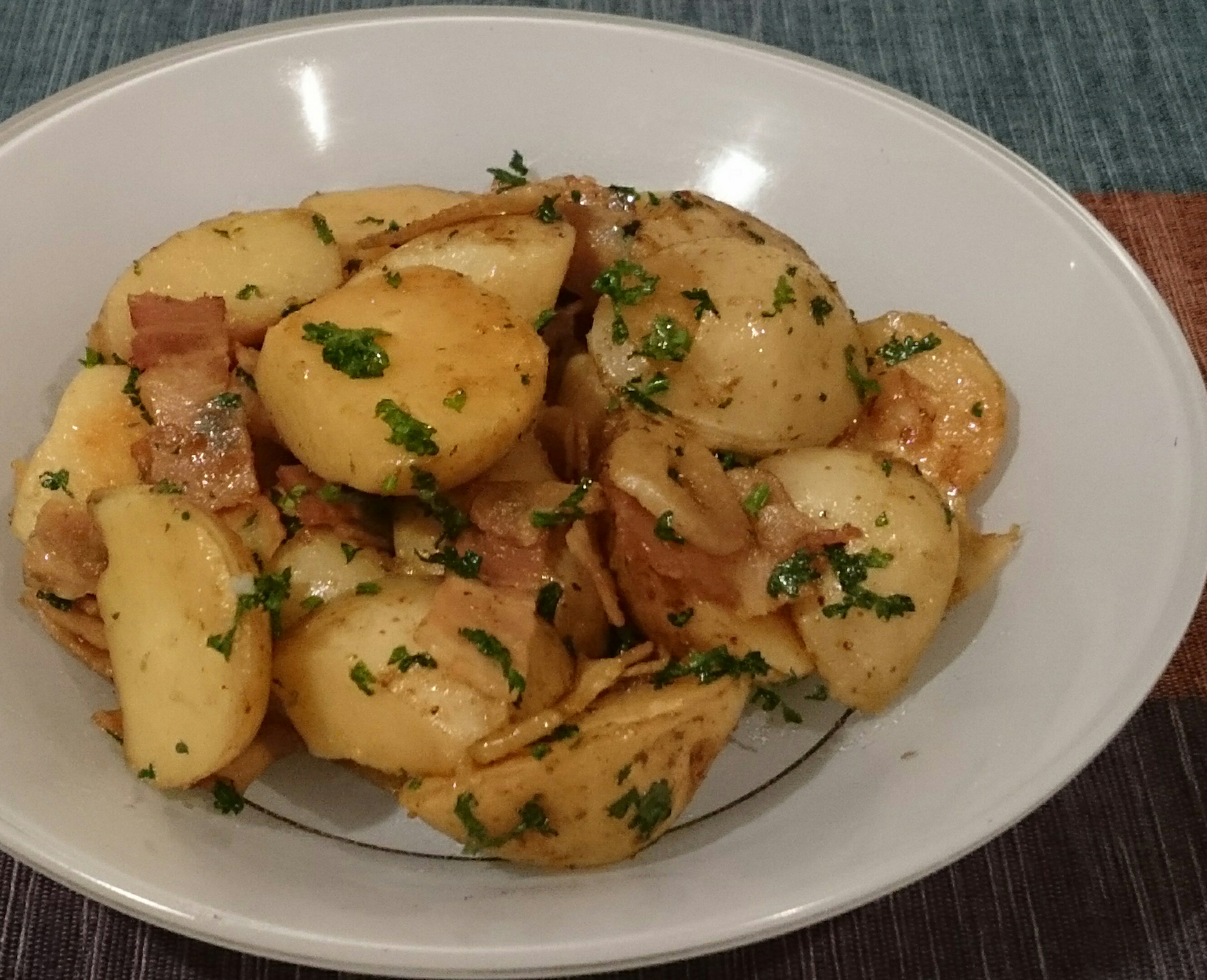 土居善晴さんのレシピです。新じゃがとベーコンで作るお惣菜、べーじゃが。じゃがいとベーコンをじっくり炒めてから、甘辛く味付けしただし汁で煮て、最後に水分を飛ばしたら出来上がり。新じゃがはいつもサラダにすることが多いけど、こちらもホクホクしていて美味しいです。