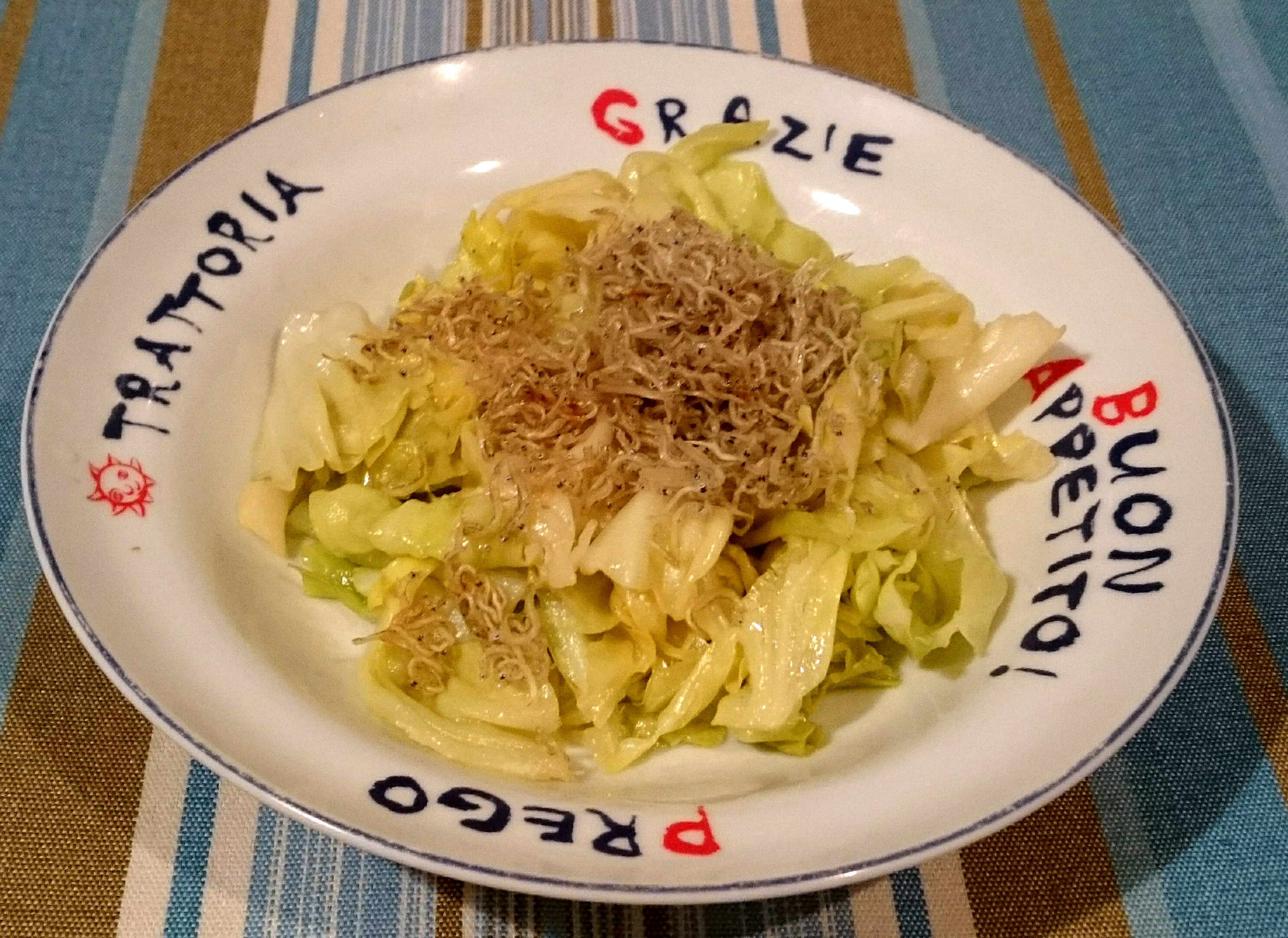 フライパンに、オリーブオイルと酢、水少々を入れてキャベツを蒸します。お皿に盛って、しらすを乗せたら出来上がり。今日はじゃこを使ったので、キャベツを取り出してから少しだけ温めて柔らかくしました。水の代わりにだし汁を使うともっと美味しくなります。
