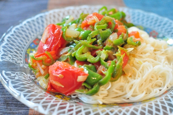 玉ねぎを炒め、ピーマン・トマトを入れて、トマトが煮崩れたらできあがり。