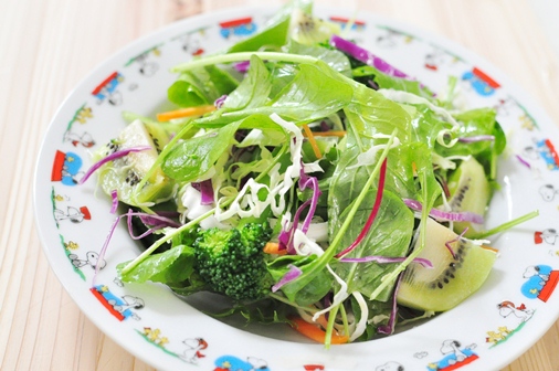 サラダのグリーンに同化していて目立たなくなっていますが、キウイフルーツがたっぷり入ったビタミンサラダです。