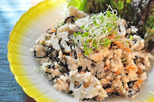 まず、おからにだし汁や酢をふっておきます。それからあらかじめ煮ておいた干ししいたけ、にんじん、ひじき、こんにゃくなどの具を入れ、甘酢レンコンも加え、これをさっくりと混ぜたら出来上がり。ひじきは、煮ものとして食卓に上ったものを使うと楽です。