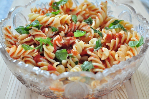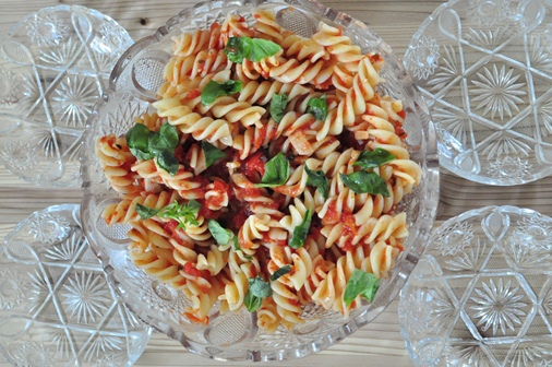 サラダにはトマトの冷製パスタをつくりました。今回はショートパスタ(フジッリ)を使ってみたのですが隙間にトマトソースがからまっていいお味。いつもは、トマトを皮ごとざくざく切ってフライパンに放り込むのですが今日は両親に食べてもらうものなのでトマトをひとつずつ湯剥きし、さらにフードカッターでソース状にしてから作りました。